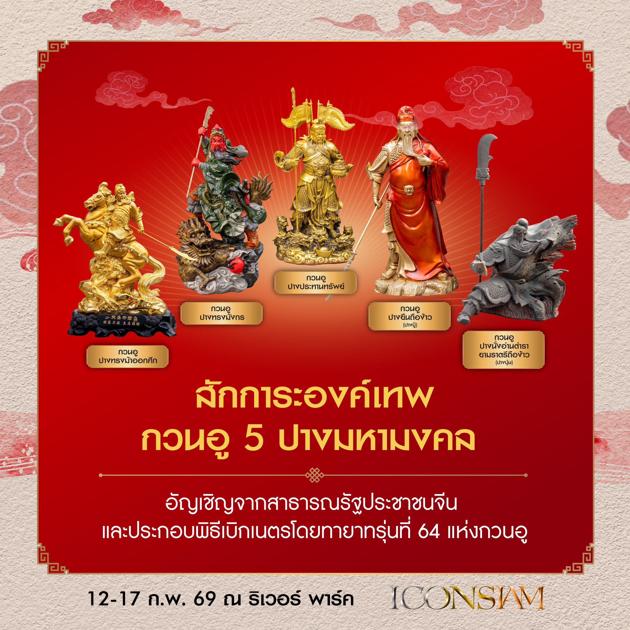 สักการะ องค์เทพกวนอู 5 ปางมหามงคล ที่อัญเชิญตรงจากสาธารณรัฐประชาชนจีน โดยได้รับความเมตตาจาก ทายาทรุ่นที่ 64 แห่งกวนอู ในการประกอบพิธีเบิกเนตร เพื่อประทานพรด้านชัยชนะ ความสำเร็จ และอำนาจบารมี ณ ริเวอร์ พาร์ค ชั้น G