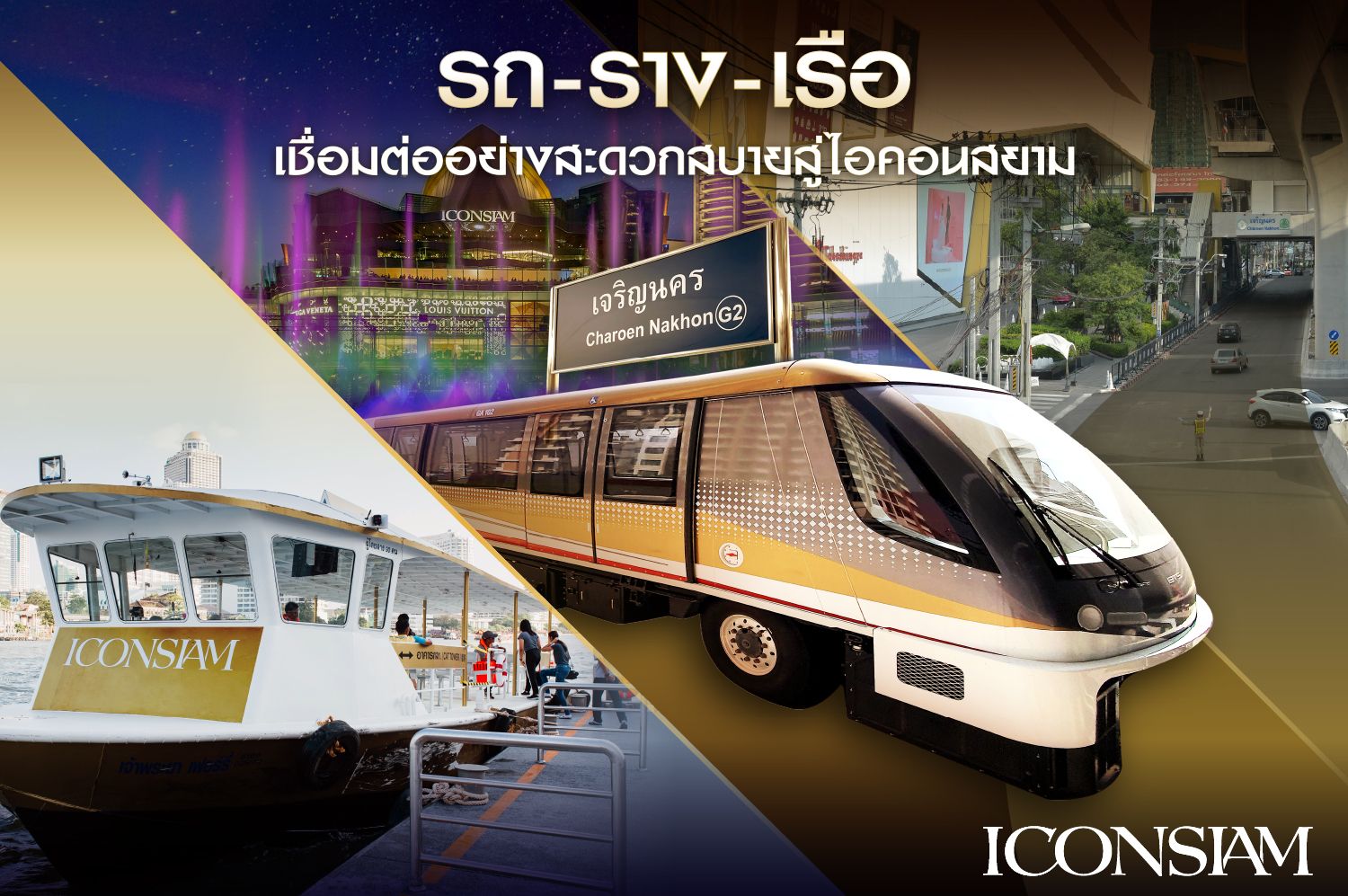 การเดินทางที่สะดวกและสมบูรณ์แบบไอคอนสยามมอบประสบการณ์การเดินทางที่สะดวกและสมบูรณ์แบบที่สุดในปี 2569 ผ่านระบบ "รถ-ราง-เรือ" เริ่มจากการเดินทางด้วย รถไฟฟ้าสายสีทอง (Gold Line) ที่เชื่อมตรงสู่สถานีเจริญนครเข้าสู่ตัวอาคารได้ทันที หรือจะเลือกดื่มด่ำบรรยากาศริมน้ำด้วยบริการ เรือรับ-ส่ง (Shuttle Boat) จากท่าเรือสำคัญอย่างสาทรและสี่พระยา สำหรับผู้ที่เดินทางด้วยรถยนต์ส่วนตัวยังได้รับความสะดวกจาก ระบบที่จอดรถสมาร์ทซิตี้ ที่ใช้เทคโนโลยี AI อัจฉริยะช่วยนำทางไปยังพื้นที่จอดรถที่ว่างได้อย่างรวดเร็ว ช่วยลดเวลาการวนหาที่จอดและเพิ่มเวลาแห่งความสุขในการเฉลิมฉลองสงกรานต์ได้อย่างเต็มที่